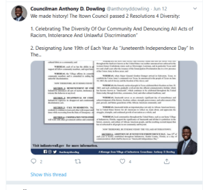 - Anthony D. Dowling, Councilor, Village of Indiantown, FL, helped pass two resolutions for diversity (6/12/20):